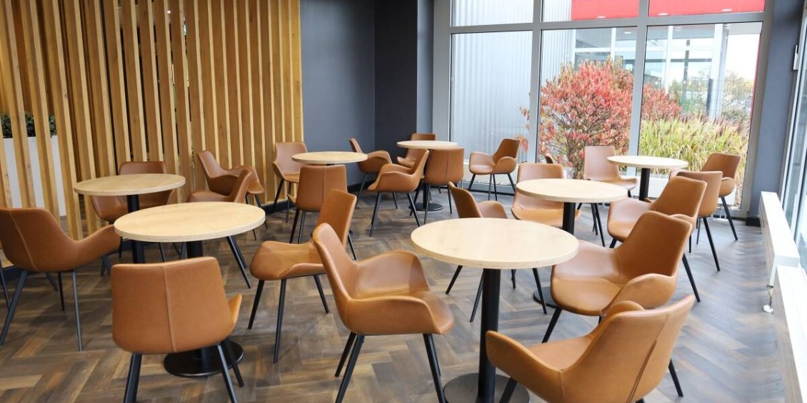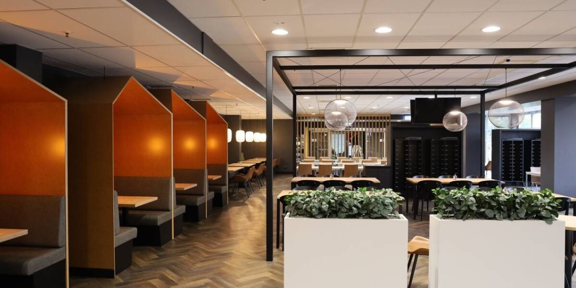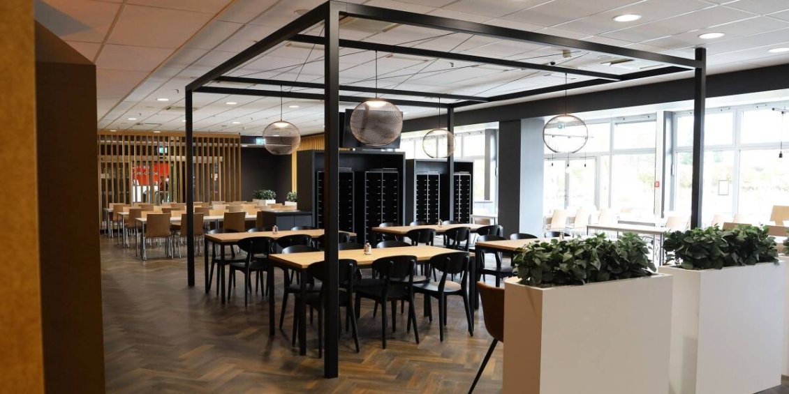 Die ursprüngliche Kantine war als Kiosk für etwa 230 Mitarbeitende konzipiert. Da der Standort jedoch stark gewachsen ist und nun bis zu 800 Mitarbeitende pro Schicht anwesend sind, hat sich der Bedarf an Verpflegung deutlich erhöht. Um Staus und lange Wartezeiten während der festen Pausenzeiten in der Logistik zu vermeiden, wurden ein Freeflow-Bereich eingerichtet und die Wegeführung optimiert. Das neue Restaurant bietet zudem ein hochwertiges Ambiente mit dunklem Fischgrätenboden, viel Tageslicht und einem einladenden Außenbereich, um die typische Kantinenatmosphäre hinter sich zu lassen.